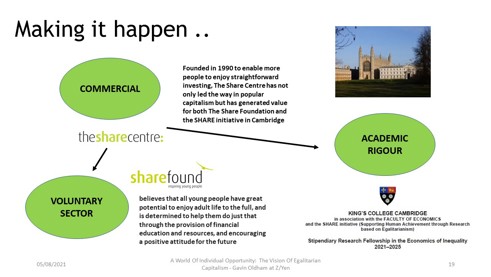 And, for inter-generational rebalancing, The Share Foundation is very active in empowering young people from disadvantaged backgrounds. We've pioneered incentivised learning and can show that it works, and we're now helping to make the Child Trust Fund a reality for those reaching 18 over the next few years, to prove how effective it is and to provide evidence for its re-introduction on a more progressive - and permanent - basis. If you’d like to help, please consider becoming a Child Trust Fund Ambassador.