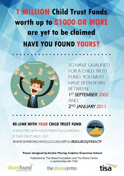 2. Via secondary schools: our ‘Claim your CTF’ poster is being sent over the next week to over 7,000 secondary schools throughout the United Kingdom, in conjunction with TISA, the ‘Tax-Incentivised Savings Association’. The initiative is being financed jointly by The Share Centre, which also runs the Shares4Schools investment competition for year 12 students, and The Share Foundation. The poster link goes initially to an explanatory page describing the search process, then links onto HM Revenue & Customs’ ‘Find my CTF’ facility via the Government Gateway. The initiative will be backed up by social media and press coverage, and we are determined to re-link very large numbers of young people with their accounts via this publicity.