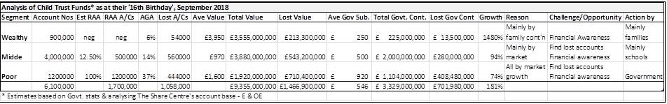 There are now over six million young people aged between eight and sixteen with these accounts, with a total value of c. £9 billion. However, notwithstanding an average value of £1,500, over one million of these accounts are lost to the young person concerned and possibly a further two million are forgotten.