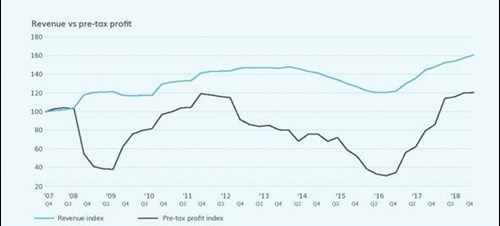 The Share Centre’s quarterly Profit Watch report released last week gave an upbeat assessment of UK businesses, both domestic and international. Nearly all sectors are seeing significant revenue growth, and it is particularly encouraging to see the banking industry slowly emerging from the aftermath of great 2008 financial crash. One of the significant aspects of the chart below is how the tide of both revenue and pre-tax profit changed so clearly for the better following the Brexit referendum, and the consequent fall in £Sterling.