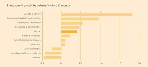 The industry breakdown of pre-tax profit growth over the past 12 months is also encouraging, although the aggregate rate of growth at 1.3% is significantly less than the 10.9% in revenues. Only domestic utilities, healthcare & pharmaceuticals, and telecoms failed to join the party.