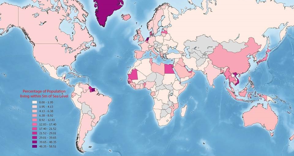This image from Reddit gives an indication of the percentage of populations living within that five metre band above sea level around the world. A moment’s glance confirms that there is massive migration ahead, particularly in, for example, Egypt (population 98 million, c. 25%) and China (population 1.4 billion, c.10%) - but it affects all continents.