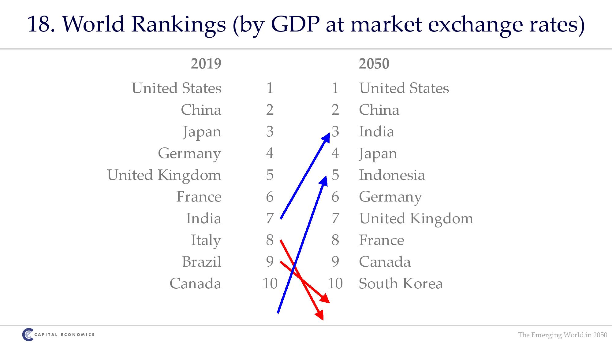 One of the most important slides in the Capital Economics Emerging Markets Forum showed the forecast rankings of countries by GDP in 2050. The most dramatic advances are for India and Indonesia; and, interestingly, China remains below the United States, held back by its authoritarian regime (a reflection on not adopting democratic capitalism), its demographics, and a levelling out of its export growth.