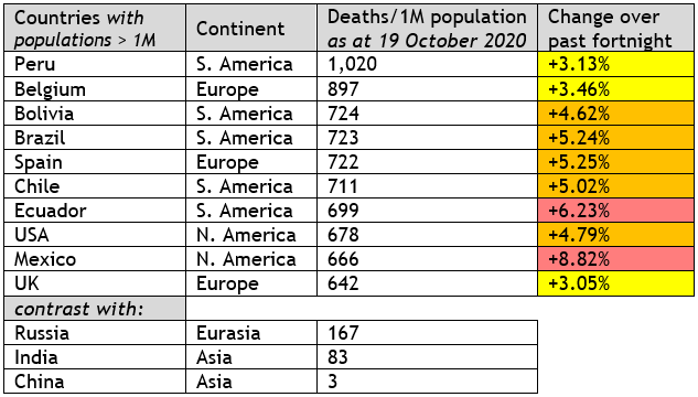 The death rate in the Americas and Europe is, in contrast, laid out for all to see and, as we reported two weeks ago, it makes tragic reading. This is the current state of the 10 countries with over one million population and the highest death rates: