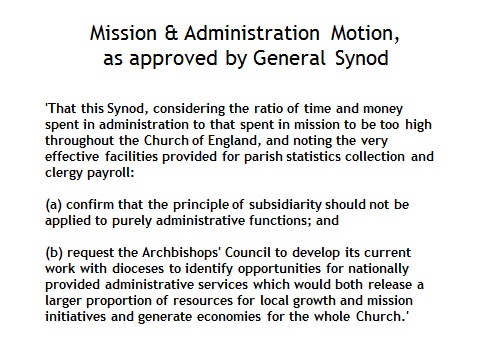 The Church has three key roles: mission, ministry and administration. Whereas ministry remains very relevant to the de-centralised parochial system, unfortunately - when it comes to administration - there is a massive overload of duplicated administration and regulation: much of which could be delivered centrally with the benefits of automation. Huge amounts of time and money are therefore wasted which could be much better employed in its ministry and mission.