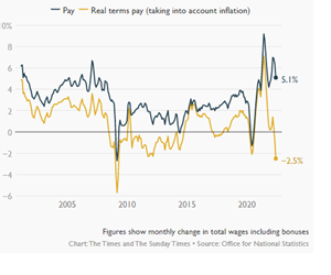 Meanwhile those with collective power are flexing their industrial muscles: closing down the railways, shutting off the post and halting container traffic in order to make their case for higher wages to compensate for soaring food and fuel prices.