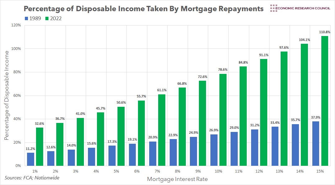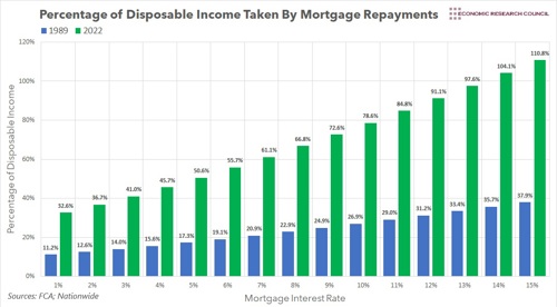 The Economic Research Council has laid this out in graphic detail in their report on mortgage repayments as a percentage of disposable income. They show how, far from entering a period of growth as Liz Truss and Kwasi Kwarteng want, intense pressure on the nearly seven million households in the United Kingdom who own their property with a mortgage has the potential to grind consumption to a halt.