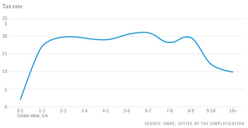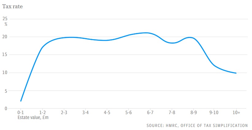 However The Telegraph article on 2nd June, following Nadhim Zahawi’s commentary, is right to call for reform of the tax. It included a chart showing how the highest effective tax rate only applies for estates valued at between £2 million and £9 million: above that level, the various exemptions — many of which are well-justified — are used to reduce that effective rate by half: