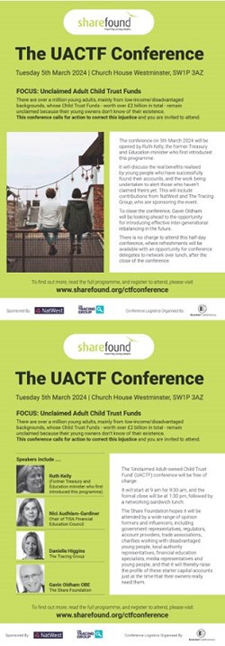 On Tuesday 5th March, they will be hosting a major conference on unclaimed, adult-owned Child Trust Funds at Church House, Westminster in order to raise the profile of this issue. Most of these accounts were allocated by HM Revenue & Customs, and they are lying unclaimed with account providers because their young owners don't know anything about them. The conference is free of charge, being sponsored by NatWest and The Tracing Group.