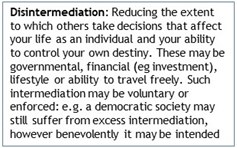 - A strong commitment to disintermediation — individual freedom and self-control (provided, of course, that it doesn’t undermine that essential respect for others and their interests).