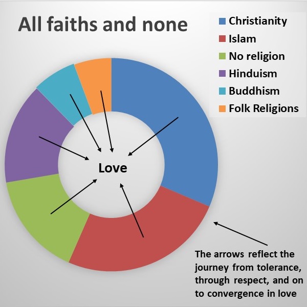 Therefore, a real yearning to celebrate the convergence of people of all faiths and none should draw on the analogy of a disc centred on unconditional love. This would envisage those very different beliefs being spread around the periphery but, as they all journey towards that central unconditional love, they are also journeying closer to each other.