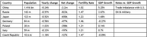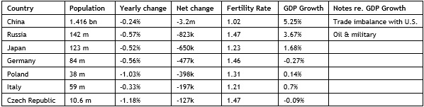 It is a fact that, unless there are exceptional reasons otherwise, the primary drive for GDP (Gross Domestic Product) is population change; but politicians don't seem to be able to connect the two in their minds. Of course, there are exceptions to this: for example, China has taken huge advantage of their massive trade imbalance with the United States over the past two decades, but this is now coming to a shuddering halt as a result of Trump's tariffs. The average GDP growth for Japan, Germany, Poland, Italy and the Czech Republic is just 0.432% per annum.