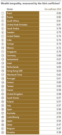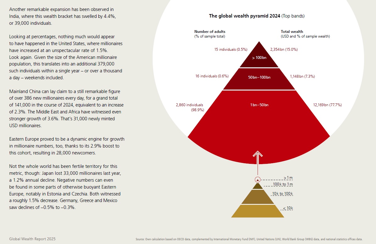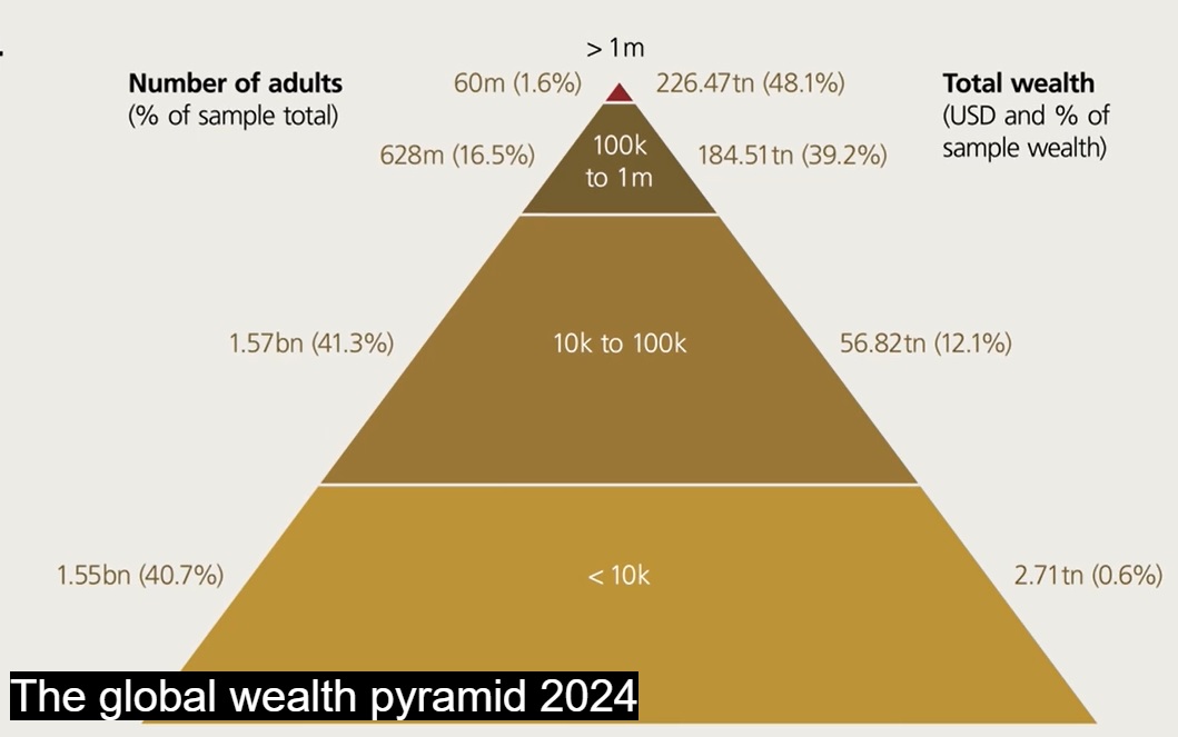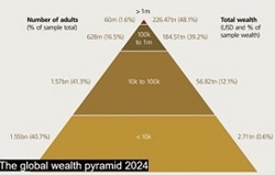 But the problem is much worse globally, as UBS has shown in its Global Wealth Report 2025. The disparities are just colossal: their ‘Global Wealth Pyramid’ shows that while the poorest 40.7% of the world's adult population owned just 0.6% of its total wealth, averaging just $1,748 each, just 1.6% own 48.1% of wealth, with their average being $3.8 million. Meanwhile the wealthiest 31 people own 30% more wealth than the poorest 1.55 billion adults put together.