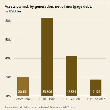 Looking in more detail at the generational differences in the United States, one of the UBS charts shows the acute differences in assets owned by generations net of mortgage debt. The Baby Boomer generation, born between 1946 and 1964, own over $83 trillion — that's nearly double that owned by those aged 46 to 61, and nearly five times as much as those born since 1981: and that's in the world's most developed nation. No wonder UBS is forecasting a huge level of inter-generational wealth transfer over the next 20-25 years.